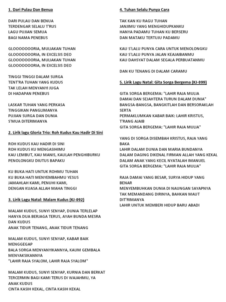 You can streaming and download for free here! Dari pulau dan benua mp3 & mp4. Muliakan tuhan glo.o.o.o.ria in excelcis deo. Dari pulau dan benua, terdengar selalu t'rus. Dari pulau dan benua terdengar selalu t'rus lagu pujian semua bagi nama penebus.