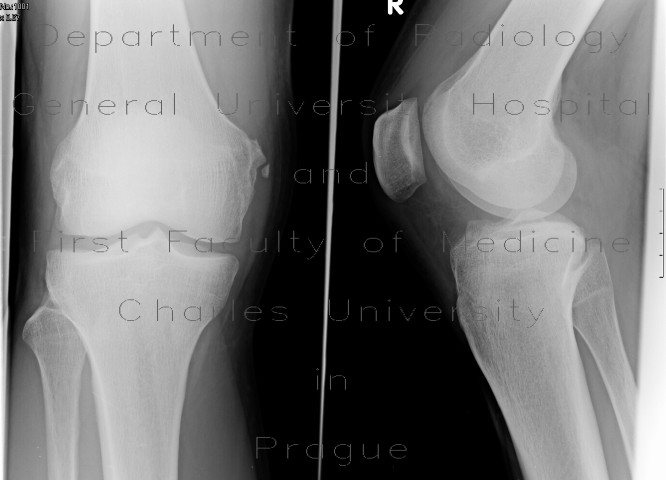 Ossification in or near the tibial collateral ligament (medial femoral collateral ligament) adjacent to the margin of the medial femoral condyle.